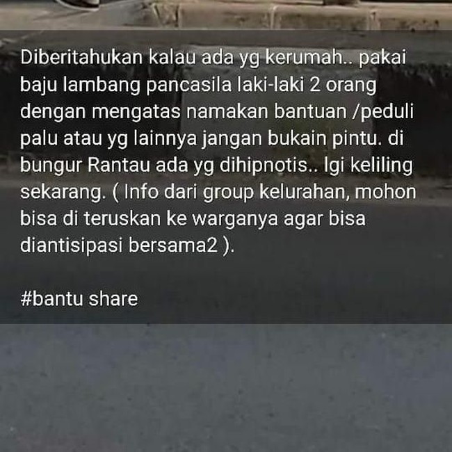 "Diberitahukan kalau ada yg kerumah.. pakai baju lambang pancasila laki-laki 2 orang dengan mengatas namakan bantuan /peduli palu atau yg lainnya jangan bukain pintu. di bungur Rantau ada yg dihipnotis.. lgi keliling sekarang. ( Info dari group kelurahan, mohon bisa di teruskan ke warganya agar bisa diantisipasi bersama2 ). #bantu share" demikian bunyi broadcast yang beredar.